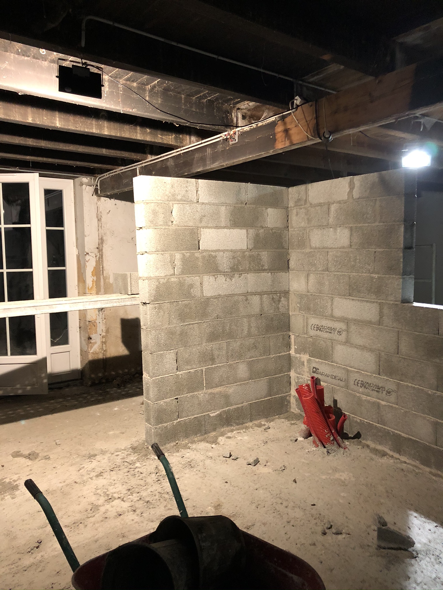 Après avoir coulé un dalle de ciment de près de 10cm, et monté les différents murs en parpaings qui déterminent l’emplacement et la surface des pièces, place au début de la réalisation d’un aspect important: la structure de la boîte dans la boîte.