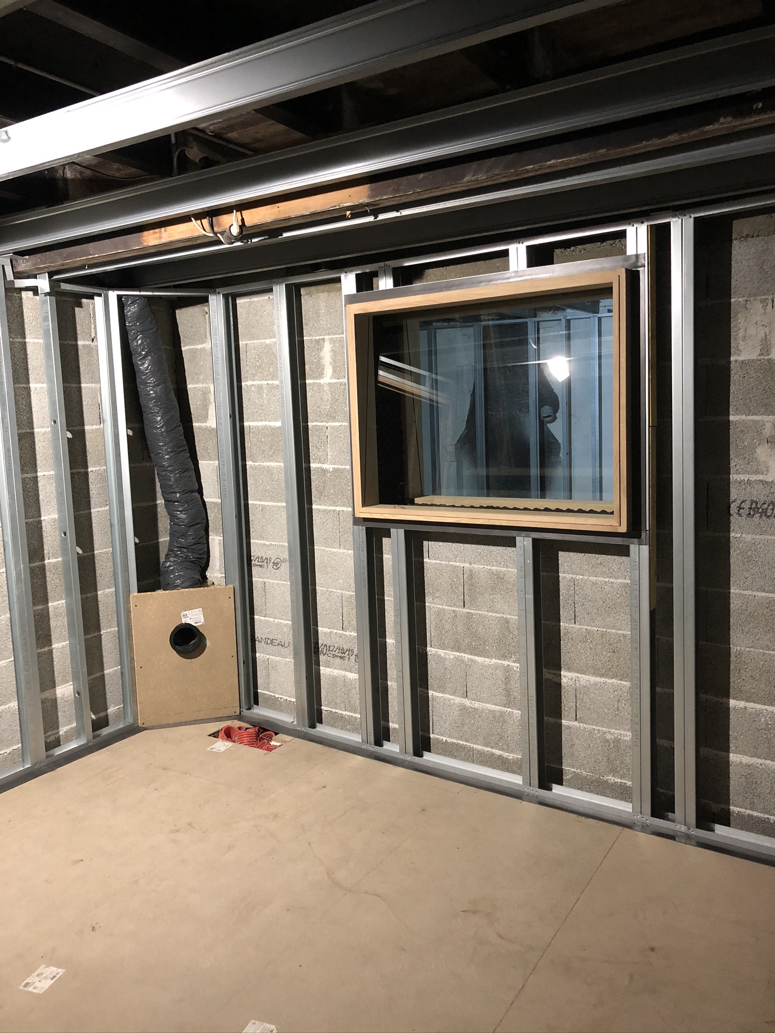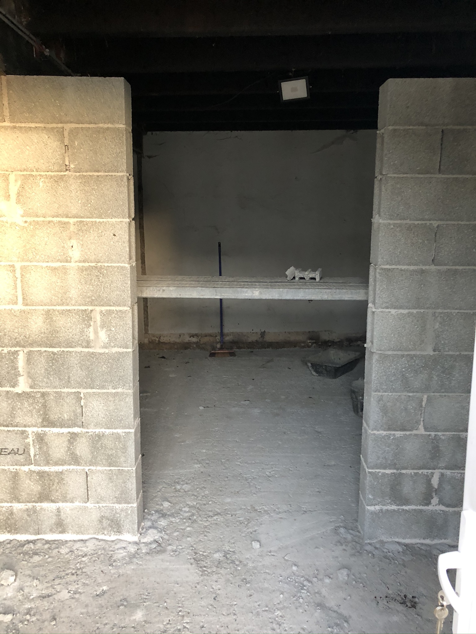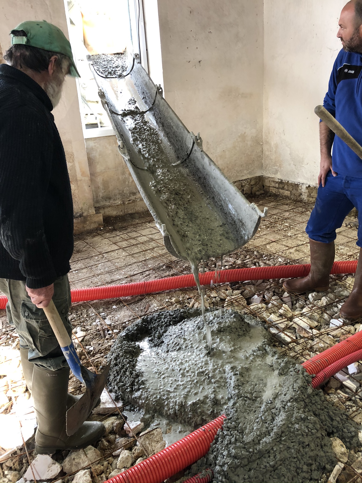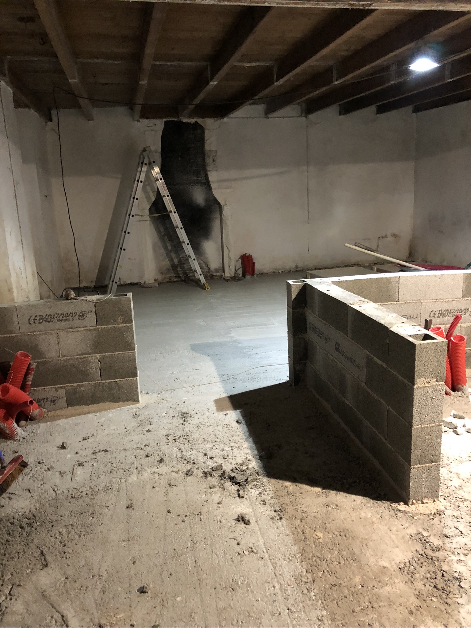 Après avoir coulé un dalle de ciment de près de 10cm, et monté les différents murs en parpaings qui déterminent l’emplacement et la surface des pièces, place au début de la réalisation d’un aspect important: la structure de la boîte dans la boîte.