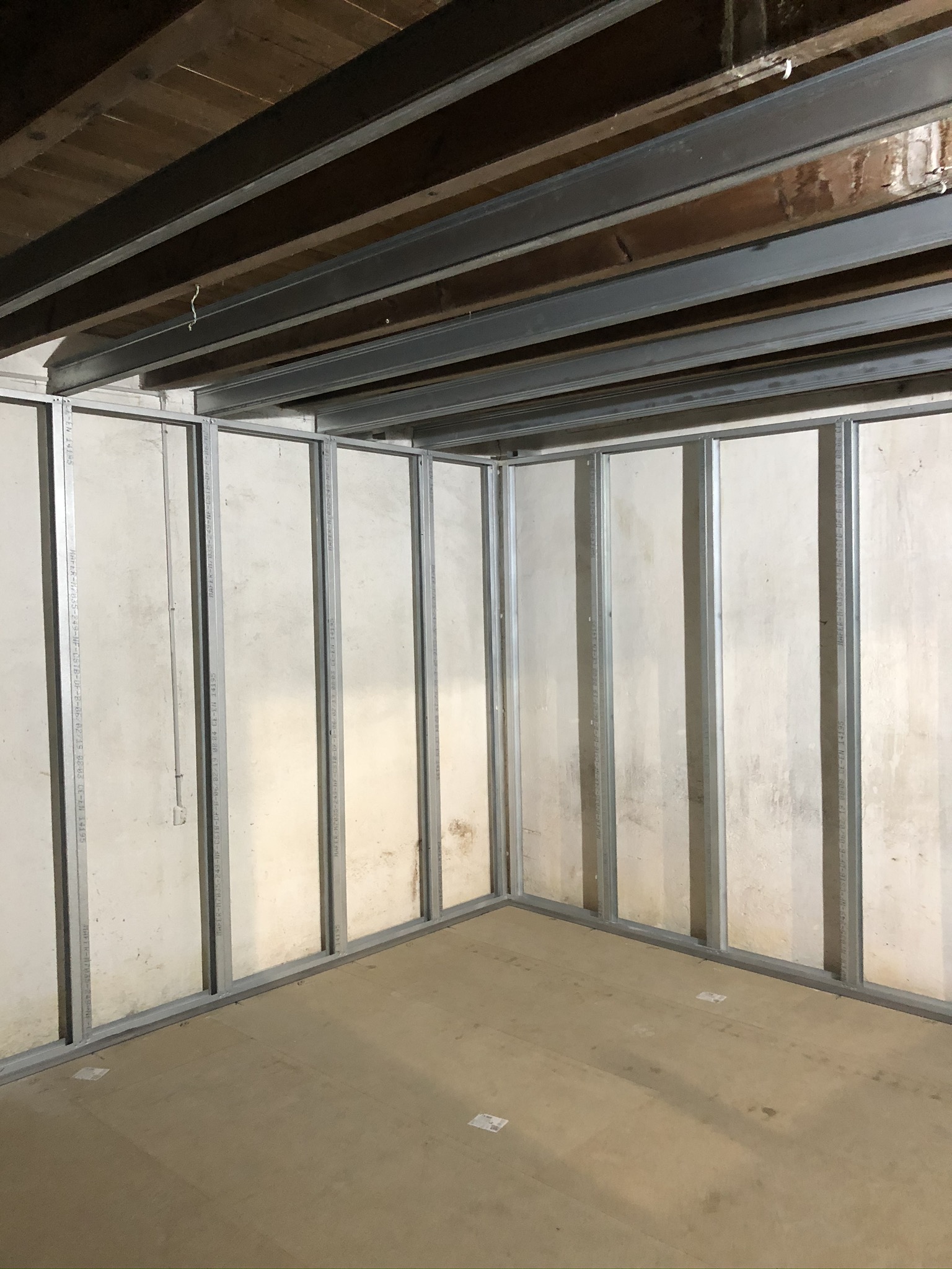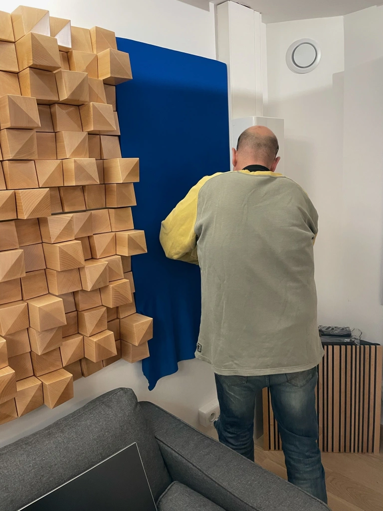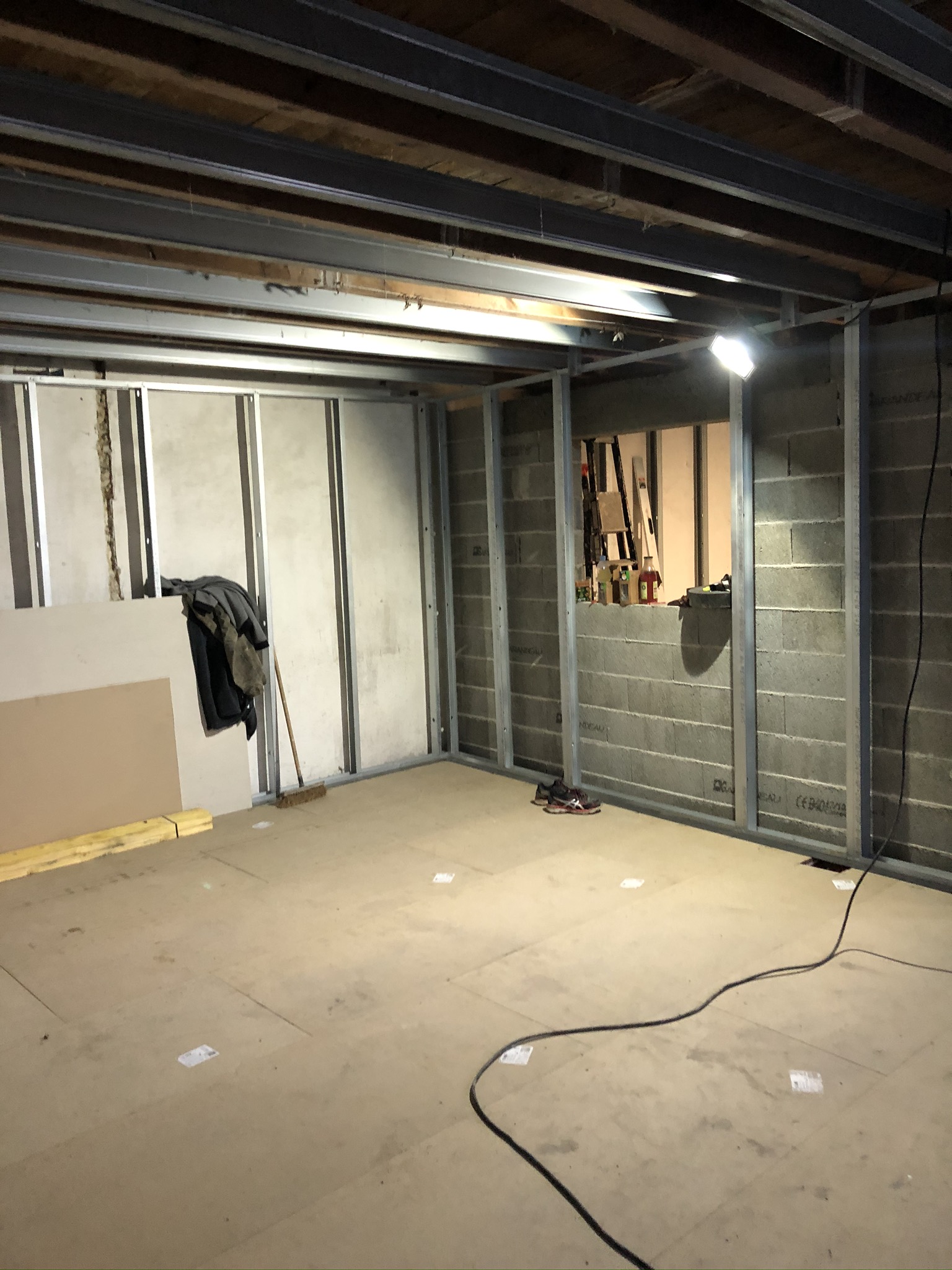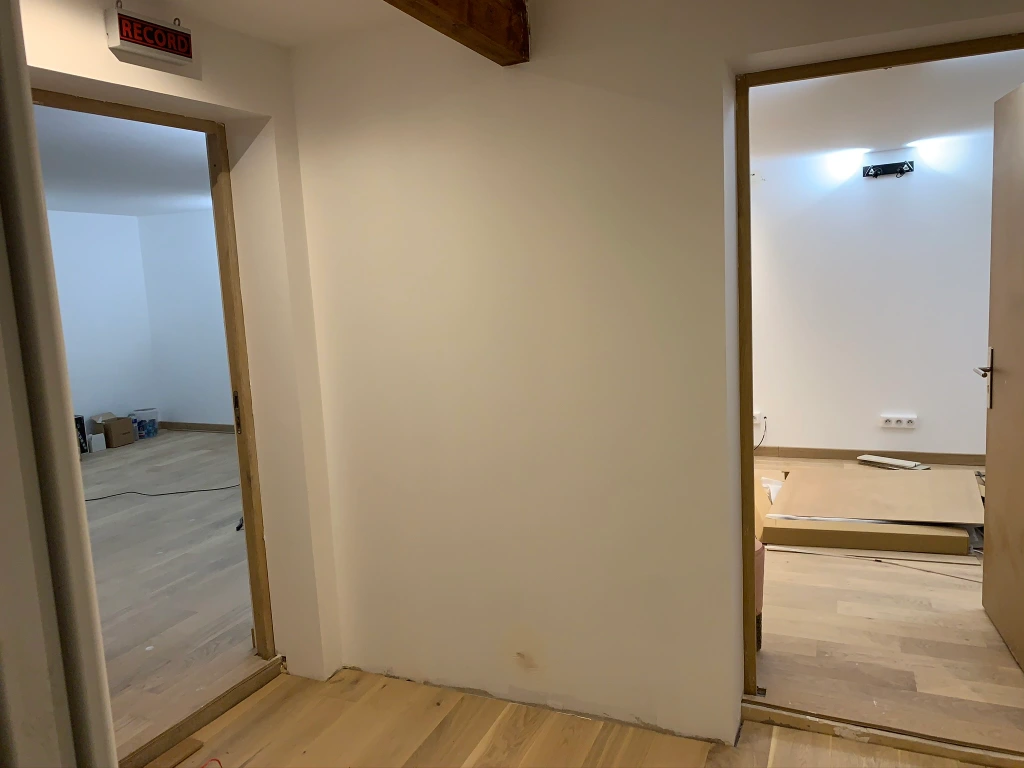 Après avoir isolé un plancher en aggloméré de la dalle de ciment via des silentblocs, il s’est construit une structure autoportée en métal afin d’isoler l’ensemble des cloisons des constructions déjà existantes.